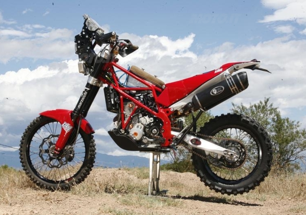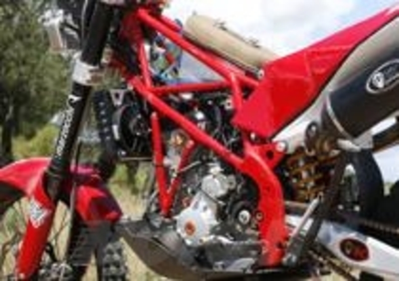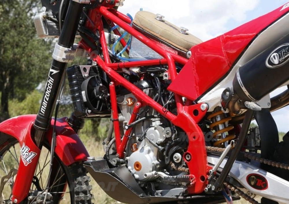 Rosso-fuoco come tutte le ultime generazioni delle creature di Prades, la PKL 450 Rally è già a prima vista una “pro”. Ogni particolare o dettaglio, ma soprattutto l’insieme della macchina da corsa, trasuda l’esperienza della Moto da Rally secondo Fernando Prades. La Moto è incentrata su un telaio a traliccio realizzato in tubi al CrMo, le cui misure e geometrie restano un segreto del costruttore, ma che rispetta l’evoluzione della Dakar sudamericana e delle moto da Rally in generale. Non è un mistero, infatti, che oggi si cerchino nuove soluzioni tese a privilegiare al massimo la guidabilità e la maneggevolezza, in contro tendenza rispetto a certi “must” degli anni passati, quando si costruivano moto potentissime e gigantesche, che per stare sui “binari” diventavano difficilissime da guidare. Stabilità e sicurezza sulle traiettorie più veloci sono oggi delegate al lavoro delle sospensioni e garantite dalla “solidità” della ciclistica. Prades è rimasto fedele a un suo vecchio credo, l’impiego di una forcella Marzocchi Shiver 50 abbinata ad un mono ammortizzatore posteriore Ohlins TTX, in questo caso assecondato dai cinematismi di un leveraggio “Made by Fernando” e di un evoluto forcellone posteriore a due bracci.