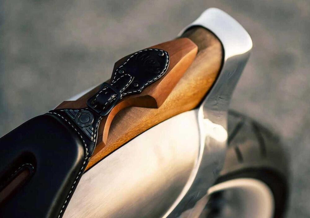 La ciclistica è in stile Chopper grazie alla forcella anteriore a parallelogramma, con doppio braccio longitudinale e monoammortizzatore centrale. I cerchi a raggi misurano 26” davanti e 18”, mentre materiali come acciaio, alluminio, pelle e mogano definiscono finiture uniche. Il serbatoio è nascosto sotto la sella per offrire un look ancora più minimale.