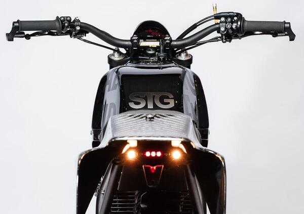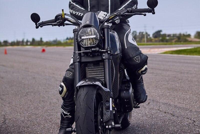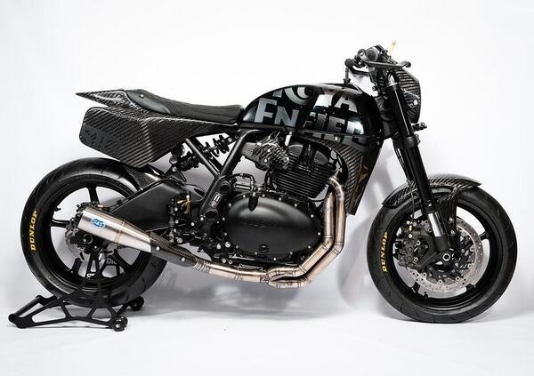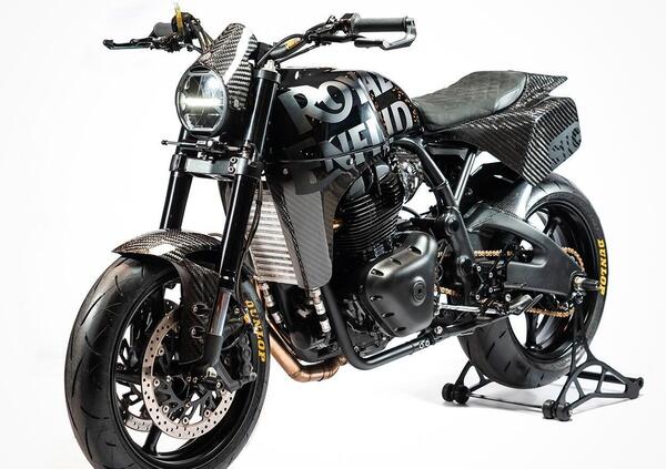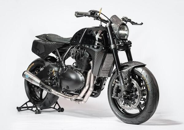 Per le sovrastrutture, compreso il codino con portanumeri in stile flat track, è stata scelta la costruzione in fibra di carbonio lasciata a vista, compreso un piccolo cupolino sopra al faro rotondo di Koso Thunderbolt.