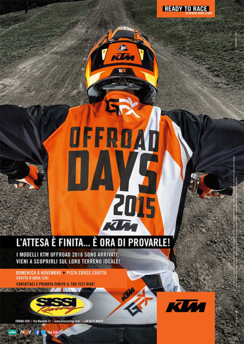 A Crotta d'Adda, a pochi chilometri da Cremona, domenica 8 novembre 2015 gli appassionati potranno provare le grandi novità della gamma 2016. Per farlo, contattate Sissi Racing cliccando qui.