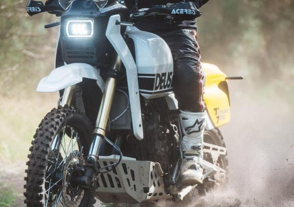 l kit rally di Deus comprende poi le citate protezioni al radiatore, il guida catena e la relativa protezione, il paramotore di alluminio e porta attrezzi Yamaha, e i paramani Acerbis.