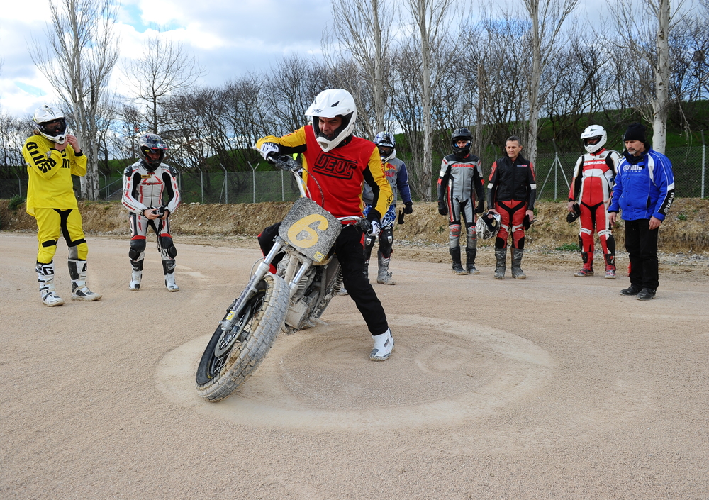 Ad aprire gli orizzonti ci pensano DI TRAVERSO Flat Track School ed il suo ideatore Marco Belli, pilota che corre proprio in questa specialità e che ha vinto diversi titoli sia in Italia ma anche in Europa (togliendosi anche qualche sfizio negli Stati Uniti!),con la collaborazione di Moto Shop Parma, concessionario ufficiale Yamaha che cura le moto messe a disposizione per i partecipanti al corso. Queste derivano strettamente dalla Yamaha SR400, moto estremamente semplice e facile da guidare modificata per l’occasione da Deus Ex Machina Italy.