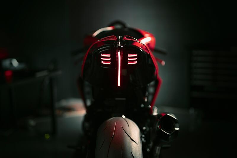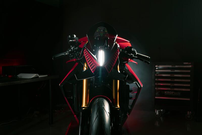 La posizione di guida è quindi rivista con una coppia di manubri piazzati molto più in basso che congiuntamente al riposizionamente delle pedane delineano un'ergonomia sportiva che va a braccetto con la ricerca della migliore aerodinamica del complesso moto/pilota.