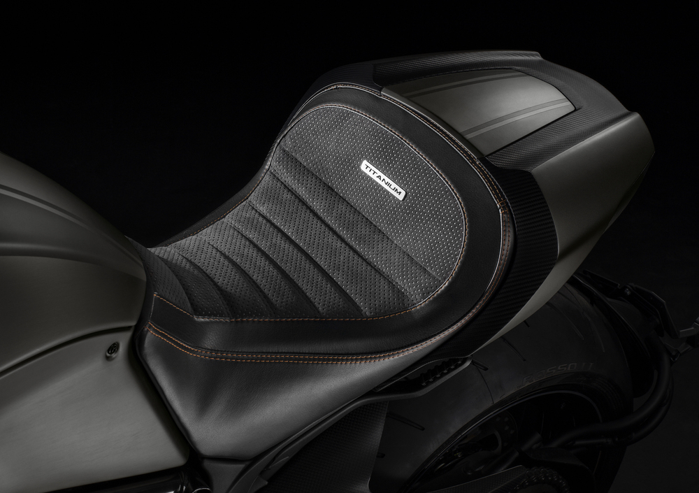 Veniamo alle differenze più importanti , ovvero alla dovizia di particolari realizzati in materiali pregiati che caratterizzano la versione Titanium, con il titanio che battezza il modello a recitare l’ovvio ruolo del leone. Lasciateci intanto esprimere un parere personale: se non amate Diavel non sarà questa la versione che vi farà cambiare idea, ma se la cruiser sportiva di Borgo Panigale solletica le vostre corde, sarà davvero difficile non restare affascinati dalla Titanium, che se possibile diventa al tempo stesso più grintosa ma anche più elegante e raffinata.