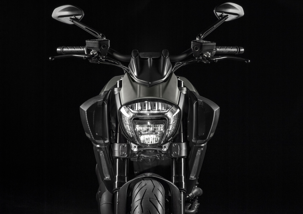 In fibra di carbonio anche le prese d’aria, nuovamente dalle dimensioni più ampie e dalla foggia più muscolosa rispetto a quelle che contraddistinguono il Diavel standard, i coperchi radiatore, il cupolino, i parafanghi anteriore e posteriore, il copripignone e il coperchio del tappo serbatoio.