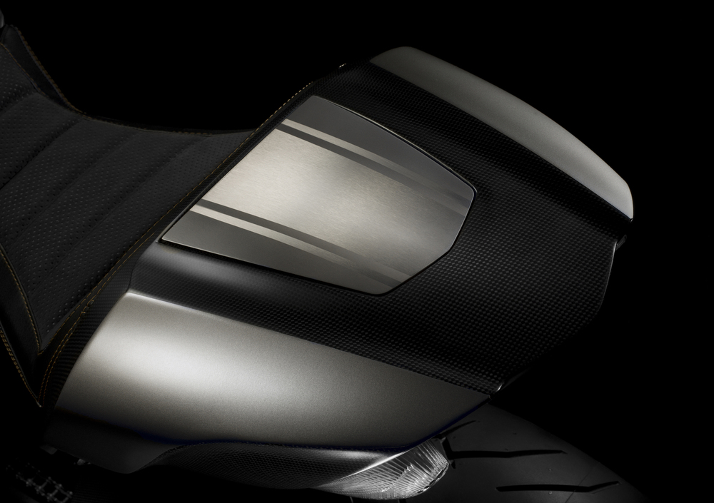 Il titanio – estremamente pregiato ed impiegato nell’automotive per le sue caratteristiche di resistenza e leggerezza – viene qui impiegato per coprire integralmente il serbatoio e per la cover del fanale anteriore. Sempre in titanio, ma integrato con la fibra di carbonio in un bel gioco di vedo-non vedo il coprisella passeggero maggiorato rispetto alla versione standard; tutte queste componenti sono state trattate attraverso nastratura e satinatura chimica per offrire una connotazione cromatica differente.