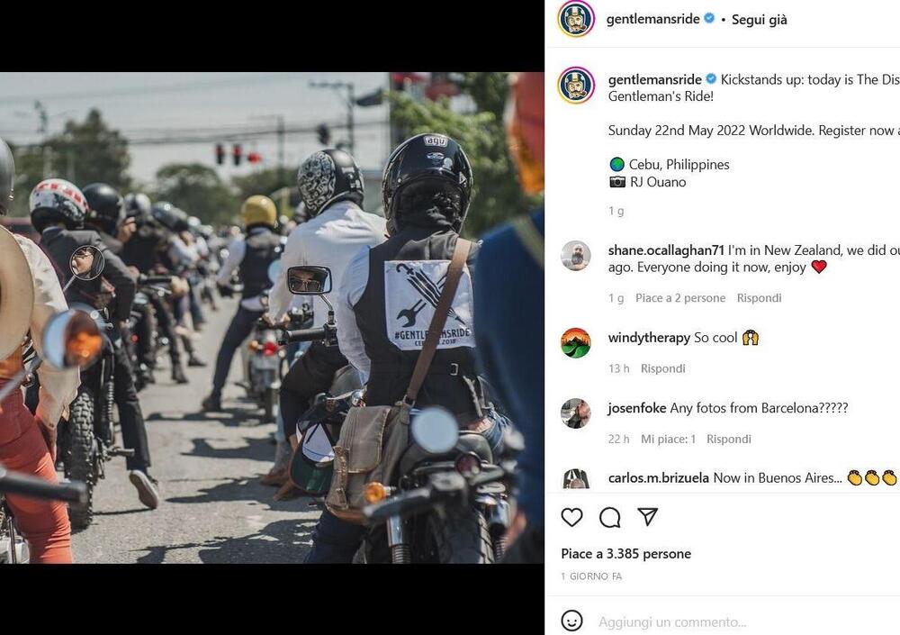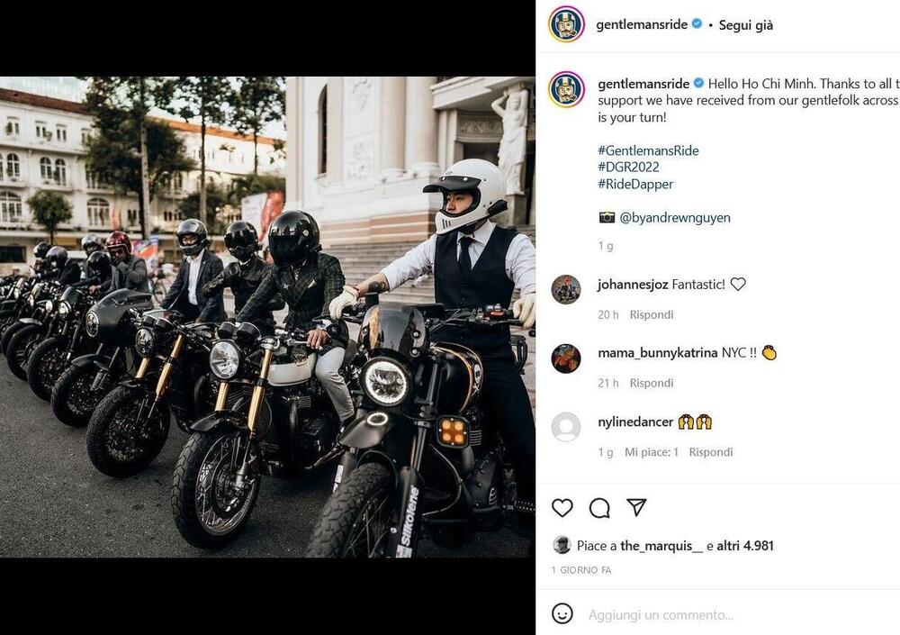 Per chi non lo conoscesse, ma crediamo siano veramente in pochi, il Distinguished Gentleman's Ride è un raduno molto singolare a partire dalla sua genesi fino al suo svolgimento quasi in contemporanea in tutti i Continenti, dove al motto di "ride dapper" (che potremmo tradurre con "in moto con eleganza", ma siamo pronti a correzioni e integrazioni) molte migliaia di motociclisti hanno inforcato la propria moto classica, modern classic, vintage, ma anche scooter, chopper o bobber, messo il loro abito migliore - in piena adesione al dress code mutuato dalla serie tv Mad Men - e dedicato il proprio 22 maggio al giro in moto benefico più elegante degli ultimi decenni, qui trovate alcuni scatti tratti dai post Instagram del profilo ufficiale del DGR.