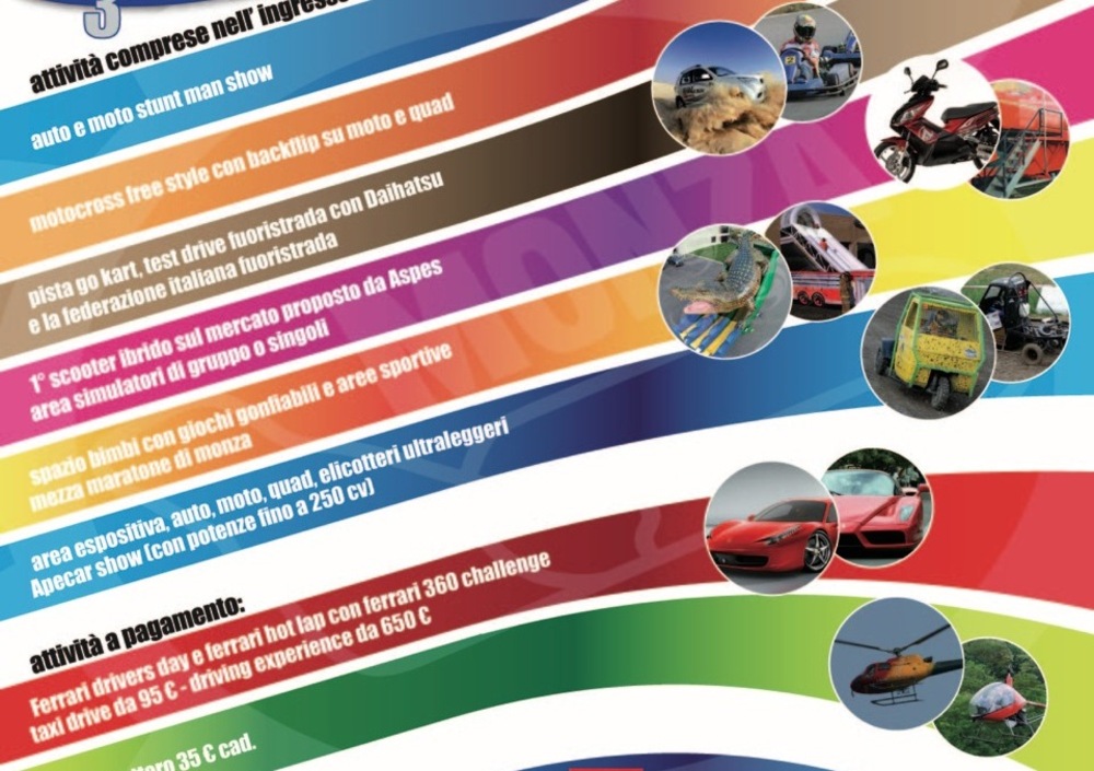 La giornata inizia con la Mezza Maratona di Monza e continua, fino alle 19.00, offrendo a tutti la possibilità di provare, anche solo per curiosità o per gioco, tanti diversi sport: dai go kart alle auto fuoristrada, con la presenza del team Daihatsu al completo, in collaborazione con la Federazione Italiana Fuoristrada e i suoi istruttori, dai giri in elicottero all’extreme off road, dalle innovative motard elettriche Quantya ad Aspes, il primo scooter ibrido in Italia.