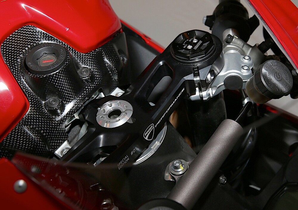 Fra questi ci sono le leve racing al manubrio, il paraleva del freno e il tappo del serbatoio. Il secondo step di allestimento prevede appunto alcune parti in fibra di carbonio come la copertura del blocchetto di accensione, il parafango posteriore, il coperchio pignone, il copricatena, i paratacchi e il coprisella. Infine il plexiglass del cupolino è quello da gara, più protettivo. Un'incisione sulla piastra superiore di sterzo riporta la dicitura Special Edition e il numero progressivo della serie.