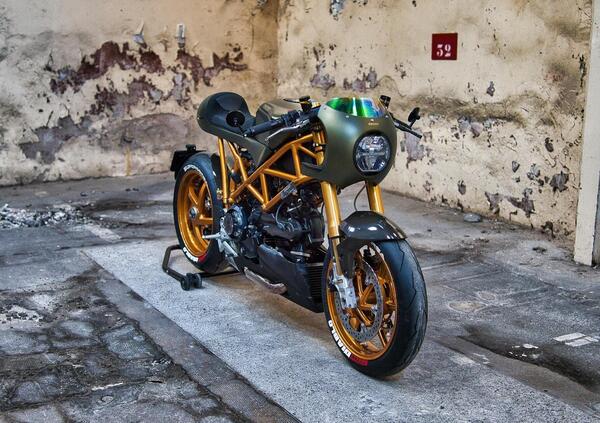 Partiamo dal nome, Cétonia. E' un coleottero dal colore verde-oro cangiante, un po' come la tinta che Jeremie ha scelto per riverniciare il telaio della Ducati standard (a cui è stato unito un telaietto posteriore creato appositamente per la sella monoposto) abbinato a sospensioni Ohlins in configurazione 100% stradale; il forcellone monobraccio è stato riverniciato – come il motore – in nero satinato. Sono poi nuove anche le piastre di sterzo.