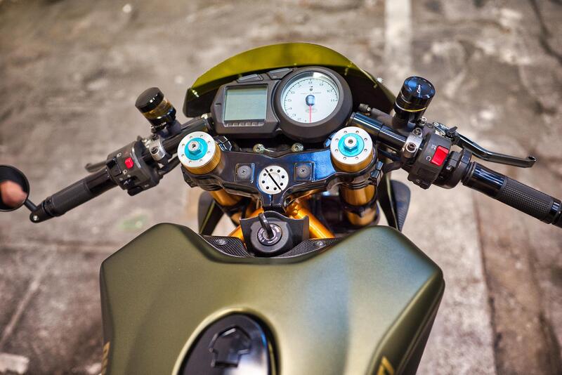 Il cupolino è di Iridium (con fanale Motogadget 3/11), retrovisori, comandi al manubrio e serbatoi idraulici sono di Rizoma.
