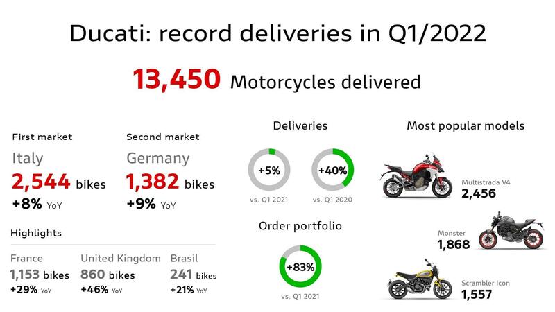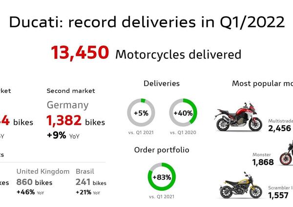 Il primo trimestre si è chiuso con 13.450 moto consegnate, un progresso del 5% sullo stesso periodo del 2021, quando la crescita raggiunse un +33% nei confronti di un inizio di 2020 penalizzato però dal primo lockdown.