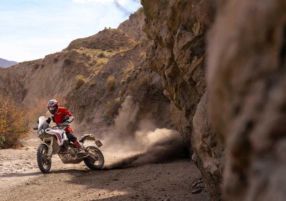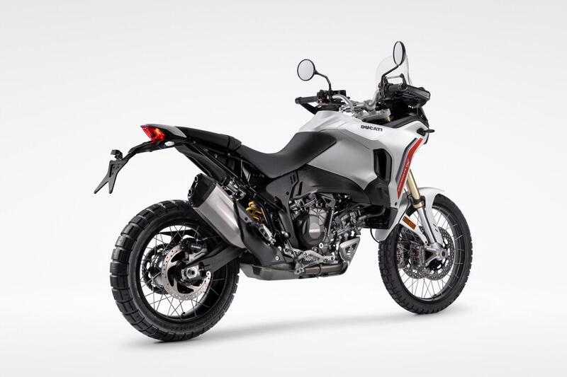 Il Ducati Quick Shift 2.0 elimina il microswitch esterno, basandosi unicamente sul sensore sul tamburo del cambio: cambiata più diretta e meno esposta a urti, fango e polvere. Il cruscotto TFT da 5" con risoluzione 800x480 offre tre Info Mode (Road, Road Pro e Rally) — il Road Pro mostra in tempo reale le percentuali di potenza e coppia utilizzate, il Rally trasforma il display in un tripmaster con possibilità di correzione manuale del contachilometri. Due porte USB di serie, passaggio automatico retroilluminazione diurna/notturna.