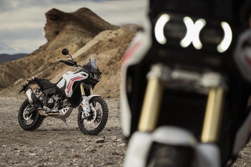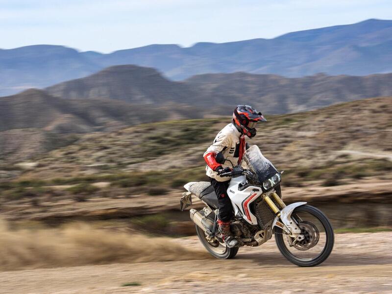 È sempre lei, ma non è più lei. Messa accanto alla prima generazione - ma già a primo colpo d'occhio - la nuova DesertX si riconosce subito sia per essere indiscutibilmente una DesertX sia per essere totalmente differente. Il frontale è il punto di differenza su cui cade subito l'occhio: il modello uscente monta due proiettori rotondi a LED direttamente a filo del cupolino, senza cornice; la nuova adotta invece due proiettori circolari incassati all'interno di una lente rettangolare trasparente, soluzione che dà al muso un aspetto più compatto e aggressivo, abbassandolo di 20 mm rispetto al precedente. Il DRL è ora orizzontale. Insomma un viso diverso ma lo stesso sguardo.