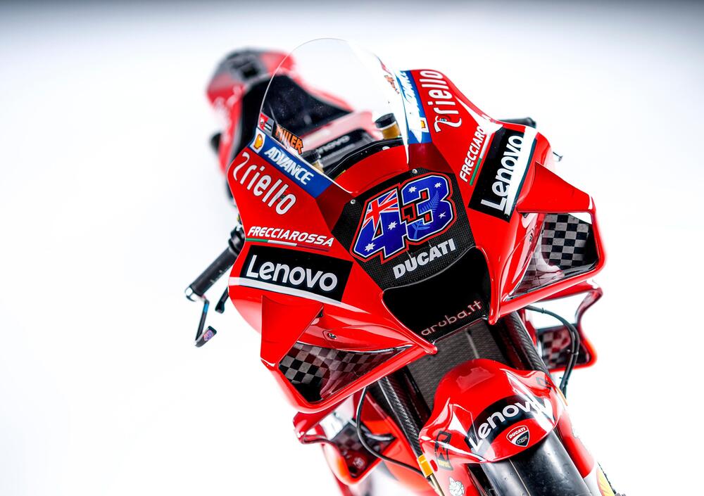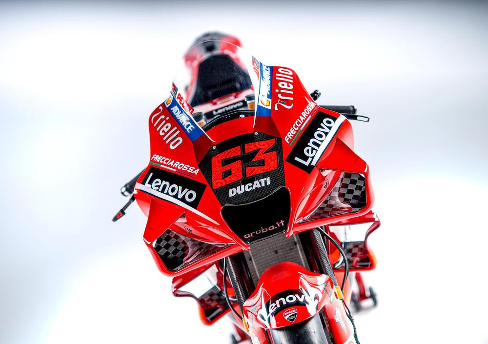 Va da sé che nessuna Casa si dilunga troppo in approfondimenti riguardo le proprie moto da competizione, ma dalle foto è possibile ammirare lo studio aerodinamico e altri dettagli del telaio, del serbatoio del carburante e dello scarico che "da lontano" non è possibile apprezzare appieno. Inoltre è possibile dare uno sguardo all'affollato ponte di comando con i pulsanti sul manubrio di sinistra mentre su quello di destra fa capolino il comando del dispositivo che varia l'assetto in accelerazione. La scheda tecnica rilasciata da Ducati è volutamente generica, ma già le foto possono dare un'idea della complessità e della cura costruttiva della moto di Miller, Bagnaia e del collaudatore Michele Pirro.