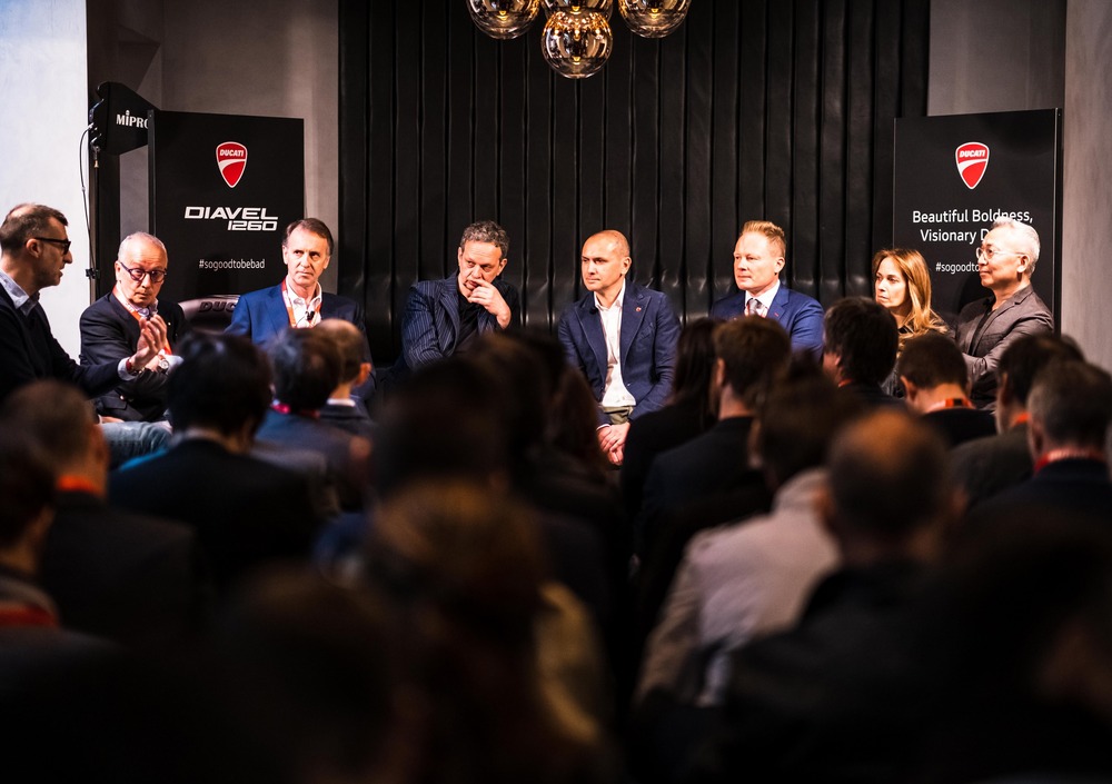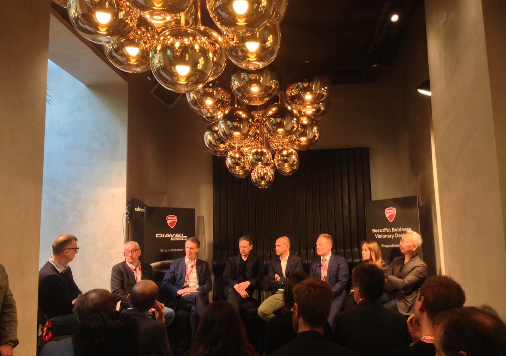 Da parte sua Ducati ha organizzato un incontro fra design sul tema "Beautiful Boldness/Visionary Design". A parlare di bellezza e audacia nel design sono stati questa mattina Andrea Ferraresi (responsabile del design Ducati), Mitja Borket (a capo del design di Automobili Lamborghini), Walter De Silva (former Chief Design VW Group), Woody Yao e Maha Kutay (Co-Directors Zaha Hadid Design), Piero Misani (R&D Director Pirelli) e Tom Dixon, designer, e nell’occasione anche padrone di casa nel nuovo locale "The Manzoni" che ha ospitato l’incontro moderato dal giornalista Michele Lupi.