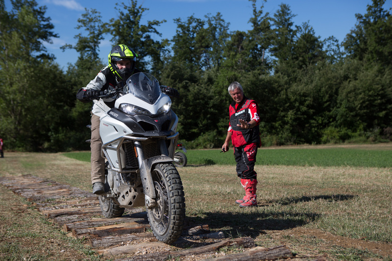 Per fortuna, per gestire i 250 kg di peso di questa “Multi” molto speciale e i 160 CV del mitico bicilindrico Testastretta, abbiamo dalla nostra parte alcuni armi da non sottovalutare. Prima di tutto la raffinatissima elettronica di questa moto. In modalità Enduro l'erogazione, le sospensioni semi-attive, l'ABS e il controllo di trazione godono di una taratura specifica, ottimizzata per la guida in off-road, mentre la potenza del motore viene limitata – per nostra fortuna – a 100 CV. Ma ci facciamo forza anche grazie alla magnifica squadra di istruttori messa in piedi dal Direttore Tecnico del DRE: Beppe Gualini, ex-dakariano che si è schierato 65 volte alla partenza dei leggendari rally-raid africani, con ben 10 partecipazioni alla “vera” Parigi-Dakar.