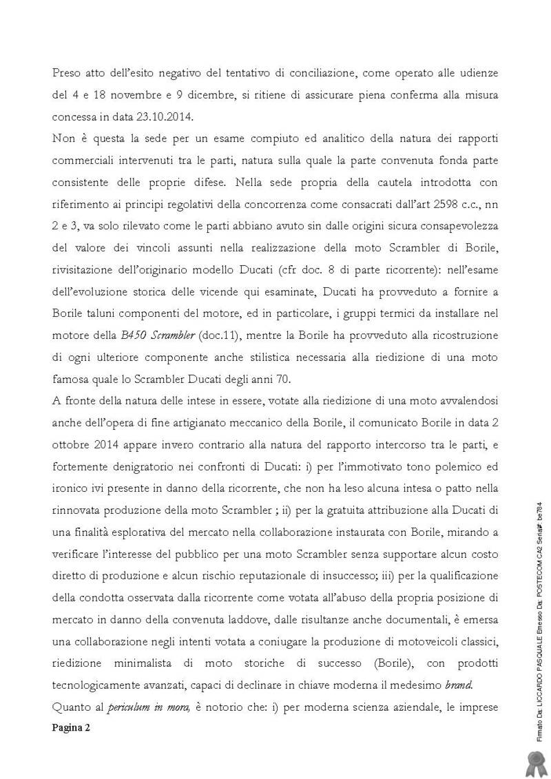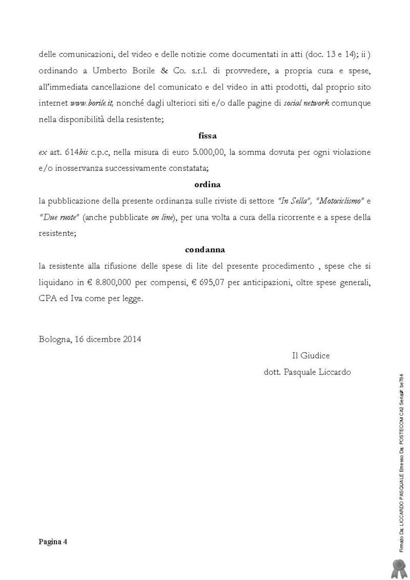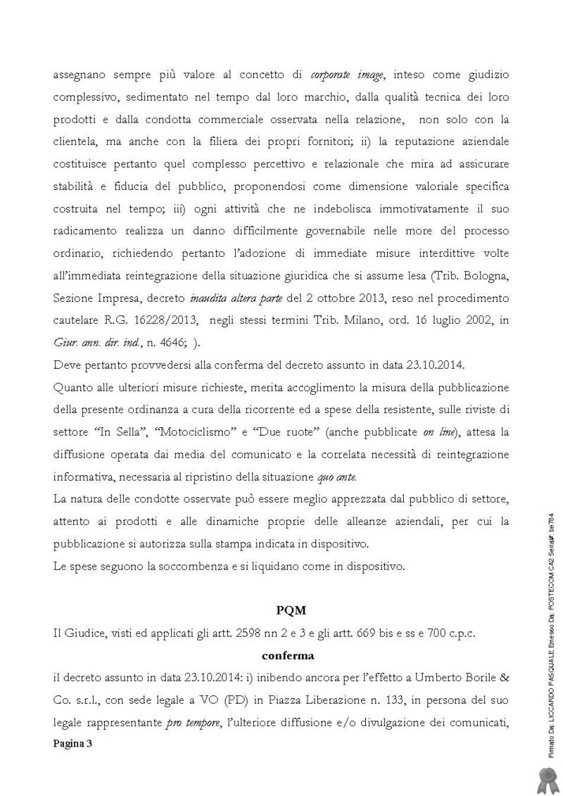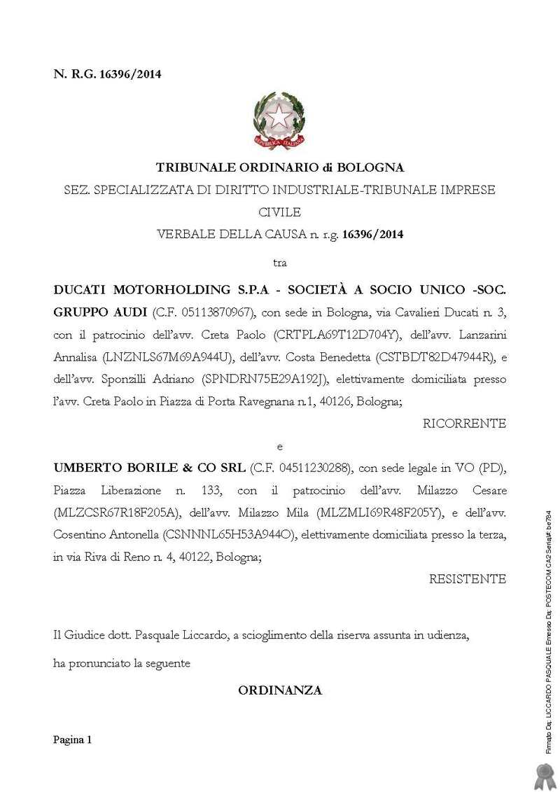 Pubblichiamo per intero la sentenza del tribunale di Bologna che multa Borile e la condanna al pagamento delle spese legali per il comunicato ritenuto denigratorio nei confronti di Ducati pubblicato il 2 ottobre 2014.