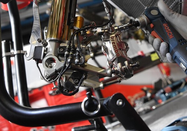 Lo studio dei tecnici di Bosch e la costante evoluzione degli elettroutensili permette ai meccanici in rosso di lavorare più rapidamente e più semplicemente. La maggior parte dei vecchi impianti ad aria compressa è stata sostituita dagli utensili a batteria nichel-cadmio, ed ora l’ultima tecnologia firmata Bosch si basa su una batteria a ioni di litio con ricarica wireless. Grazie a questa soluzione, sono state abolite le stazioni di ricarica ed è stato ridotto il numero di batterie supplementari. Inoltre, l’aumento della capacità della batteria (da 6Ah, mantenendo però peso e dimensioni) permette ai meccanici di Borgo Panigale di utilizzare gli utensili per un’intero turno, un arco di 8 ore circa a seconda del tipo di utilizzo che ne viene fatto.