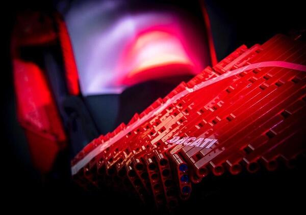 Perché - altra sorpresa - la porta del box si è alzata su un'altra realizzazione sbalorditiva: una Panigale V4R interamente carrozzata con mattoncini LEGO Technic. Una vera e propria replica 1:1 della V4R, che campeggiava al suo fianco, raffinatissima e di una precisione affascinante, opera del reggiano Riccardo Zangelmi, uno dei pochi LEGO Certified Professional in Italia. Riccardo da anni crea opere d’arte in mattoncini (anche se è stata la prima volta in cui si è cimentato con i mattoncini LEGO Technic) e si è dichiarato entusiasta del risultato: “Partecipare a questo progetto di LEGO Italia e Ducati è stata la sfida professionale più entusiasmante che abbia mai affrontato. Sono andato oltre ogni limite e ho vinto tagliando il traguardo in team. Mi sono approcciato al progetto come avrebbe fatto un pilota ufficiale della Casa di Borgo Panigale, spingendo al massimo in pista, cercando e superando nuovi limiti. Io per primo guardo oggi le due moto, fianco a fianco, e sono felice di aver colto il DNA che caratterizza sia LEGO Technic che Ducati, ricreando in mattoncini la moto simbolo dell’eccellenza italiana”.