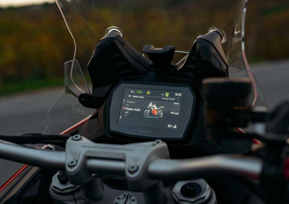 Il pacchetto elettronico è completo, gestibile attraverso comandi al manubrio ridisegnati e al nuovo cruscotto a colori TFT da 5”, con interfaccia multilingua completamente rinnovata e basata su tre diversi Infomode. I cinque Riding Mode disponibili (Sport, Touring, Urban, Enduro e Wet) offrono la possibilità di adattare la Multistrada V2 a qualunque situazione, impostando su valori preconfigurati e modificabili potenza e risposta del motore, grazie ai 4 Power Mode di cui è dotato il motore. I Riding Mode, ovviamente, impostano su livelli predefiniti, e modificabili dal pilota, l’ABS cornering, il Ducati Traction Control (DTC), il Ducati Wheelie Control (DWC) e l’Engine Brake Control (EBC).