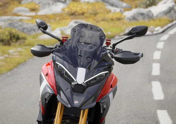 Nonostante i 170 CV la Multistrada nasce per essere sì prestazionale, ma anche versatile. Manubrio alto, posizione di guida rilassata e tutti i confort per affrontare anche il più tosto dei viaggi. Oltre all'equipaggiamento di serie, già ricco di chicche, sulla Multistrada V4 S abbiamo installato: