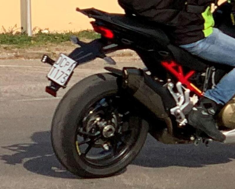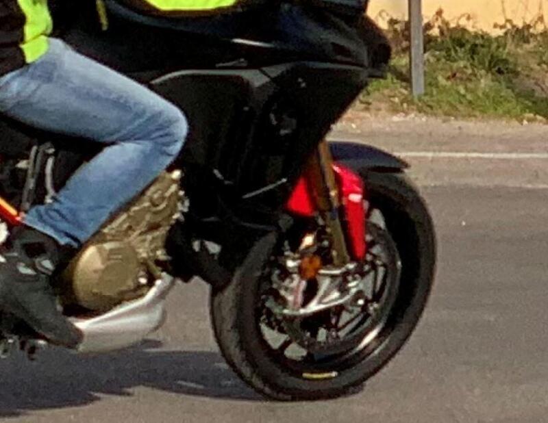 L'immagine mostra chiaramente l'avantreno con la ruota da 17 pollici invece che da 19, la forcella con nuovi attacchi per le pinze radiali Brembo Stylema del tutto simile a quelli della Streetfigher V4, dischi da 330 mm e un differente parafango.
