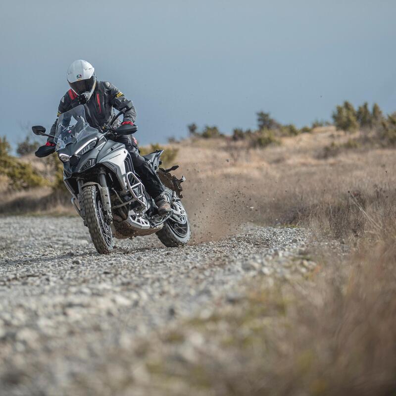 La questione è cercare di prevedere come potrebbe essere. Nel senso che per filosofia tecnica la V4 1100 (1.158 cc effettivi) è stata definita con un avantreno che monta la ruota da 19 pollici: una scelta che va nella direzione di una superiore polivalenza d'uso, favorita anche dallo sviluppo di pneumatici performanti su strada e con tali potenze, poiché si tratta pur sempre di 170 cavalli (contro i 158 della Multistrada 1260 bicilindrica) per una moto che pesa di 215 kg dichiarati a secco (nella galleria fotografica qui sotto).
