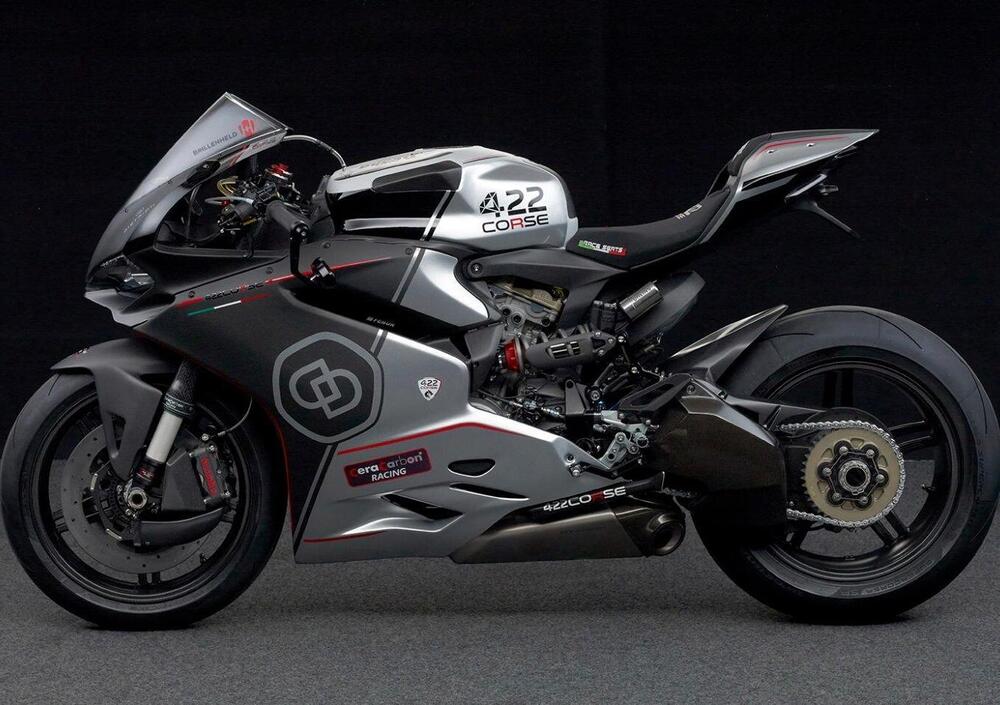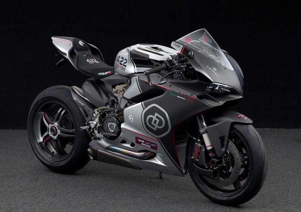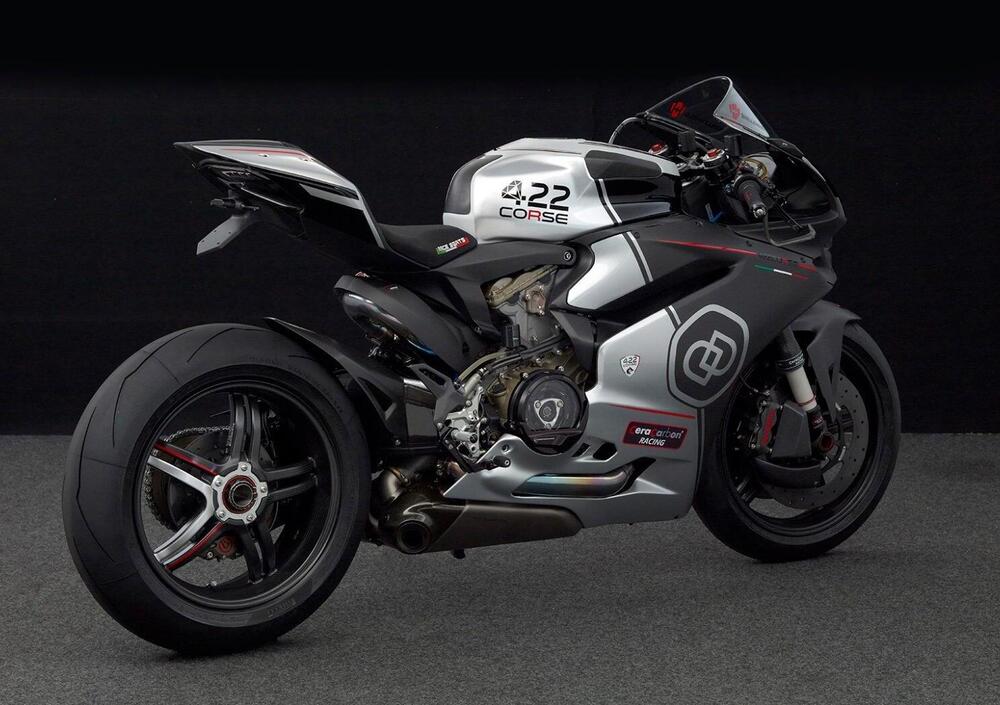 La sua Panigale 442Corse risalta per la particolare verniciatura bicolore, ma basta uno sguardo per notare diverse componenti non originali. Sotto l'abito, intanto il telaio è diventato in fibra di carbonio, così come il forcellone monobraccio.