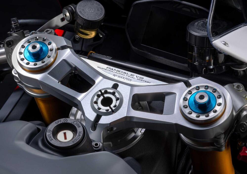 Come ogni Ducati da collezione, la Panigale V2 Superquadro Final Edition è resa unica dalla piastra di sterzo, in questo caso ricavata dal pieno, su cui è riportato il numero dell’esemplare. La moto sarà corredata di un certificato di autenticità e di un telo coprimoto personalizzato.