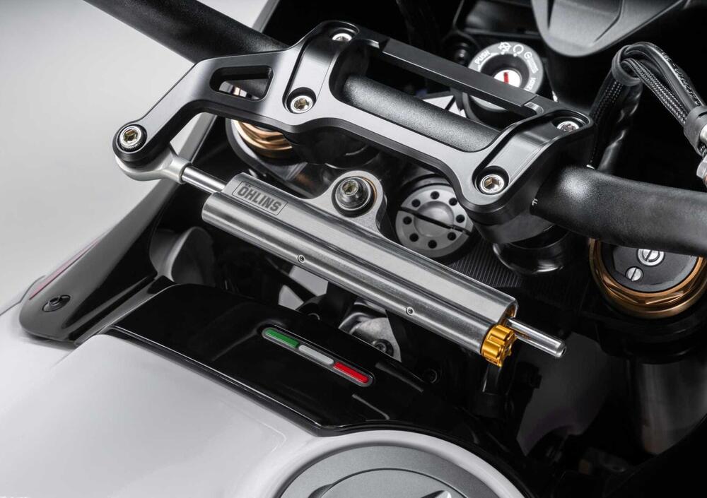 Per migliorarne scorrevolezza e resistenza all’usura, inoltre, i foderi sono dotati di Kashima Coating e gli steli con trattamento superficiale DLC. L’escursione ruota aumenta di 20 mm, per un totale di 250 mm. Per migliorare inoltre la guidabilità in off-road, la DesertX Rally monta un ammortizzatore di sterzo Öhlins regolabile e fissato direttamente al manubrio con supporti ricavati dal pieno.