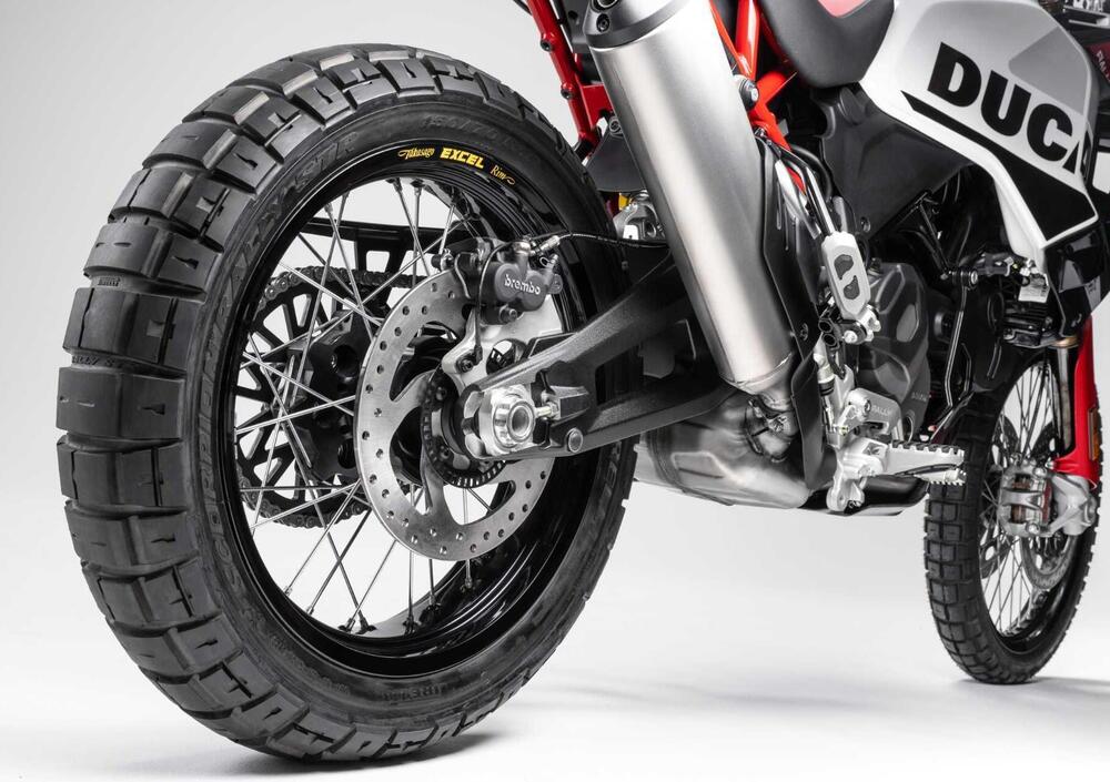 Sempre in ottica di miglioramento delle prestazioni fuoristradistiche la DesertX Rally è equipaggiata con ruote caratterizzate da misure specifiche per l’offroad, più robuste e leggere grazie a mozzi ricavati dal pieno, raggi centrali in acciaio al carbonio e canali per camera d’aria Takasago Excel ad alta resistenza.
