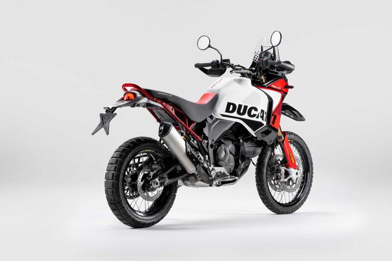 Il catalogo di accessori Ducati Performance si arricchisce di accessori per chi desidera ulteriormente personalizzare anche la DesertX Rally. Si parte dal serbatoio supplementare da otto litri che garantisce quasi il 40 percento in più di autonomia ed è perfettamente integrato nella linea della moto. Sono disponibili le valigie laterali in alluminio che, combinate al top case, danno alla moto una capacità totale di carico di quasi 120 litri. Per i viaggiatori che non si fermano mai ci sono anche i faretti supplementari a led e le manopole riscaldabili. Troviamo poi paramotore in tubi di acciaio a protezione di serbatoio e motore e l'immancabile scarico omologato Termignoni. Chi poi volesse utilizzare la DesertX Rally nelle competizioni può migliorare i valori di potenza e coppia del +7% attraverso lo scarico racing, sempre Termignoni. Gli appassionati che vorranno completare il proprio look potranno scegliere fra diverse proposte di abbigliamento specialistico con grafica coordinata alla livrea della DesertX Rally. La collezione, che comprende anche la linea donna, è composta da completo giacca-pantaloni Explorer, guanti Atacama, stivali Explorer T7 e casco Arai Tour-X5.