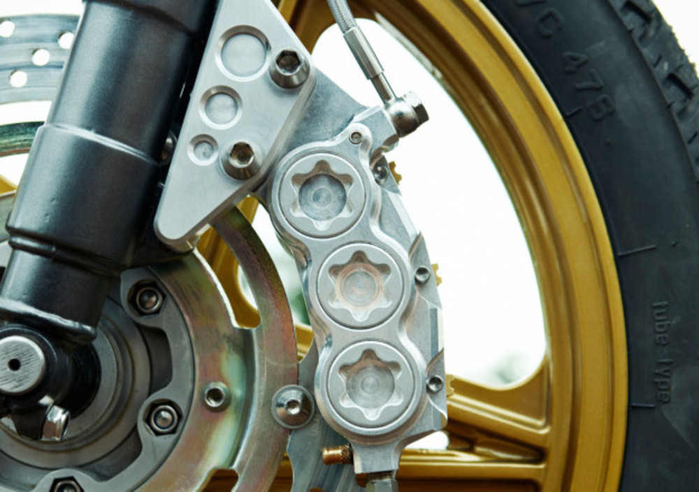 Il lavoro ha dato vita ad una moto particolarmente riuscita e fuori dai canoni tradizionali, soprattutto da un punto di vista cromatico. Il freno anteriore conta su un disco di provenienza BMW R1200GS ed un impianto composto da un mix di parti ISR ed AP Racing. La forcella è quella di serie, ovviamente restaurata e riportata all’efficienza originaria, mentre le piastre di sterzo provengono da una vecchia Suzuki RM da cross.