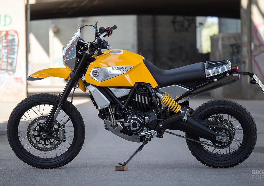 La preparazione è radicale: via la ruota anteriore da 19”, sostituita con una da 21” a raggi (così come la posteriore), e dentro anche il parafango anteriore, la forcella e l'ammortizzatore posteriore di una Desert Sled 800 per avere una moto con maggiore luce a terra e più adatta al fuoristrada. Ovviamente forcella e mono sono stati ritarati per armonizzarsi con la maggiore massa della Scrambler 1100, mentre il telaio posteriore è stato sostituito con un'unità realizzata da Officine Rossopuro: molte sovrastrutture sono state realizzate in alluminio a partire dal portafaro decisamente anni '80, per finire con il serbatoio particolarmente accattivante nel dettaglio dove vanno ad inserirsi gli steli della forcella quando lo sterzo è ruotato, mentre il portapacchi posteriore nasconde una trousse di attrezzi.