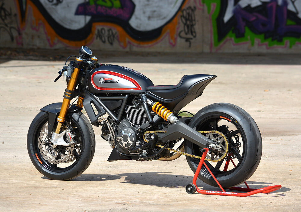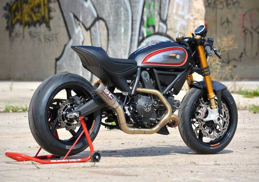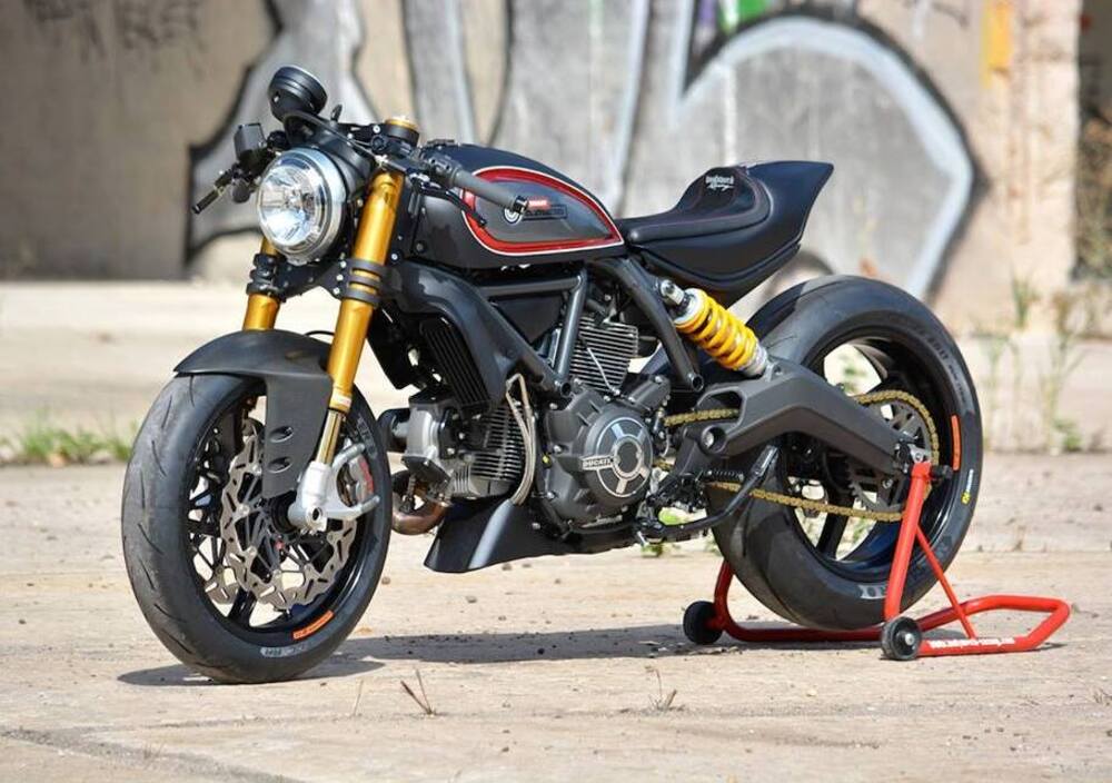L'elaborazione del motore di serie ha riguardato condotti, valvole, assi a camme, testate e albero motore. La cilindrata è rimasta a 803 cc, mentre l'impianto di scarico si deve agli specialisti della SC Project che hanno scelto un terminale corto e alto in stile MotoGP. Con queste cure la potenza sarebbe salita a un centinaio di cavalli.
