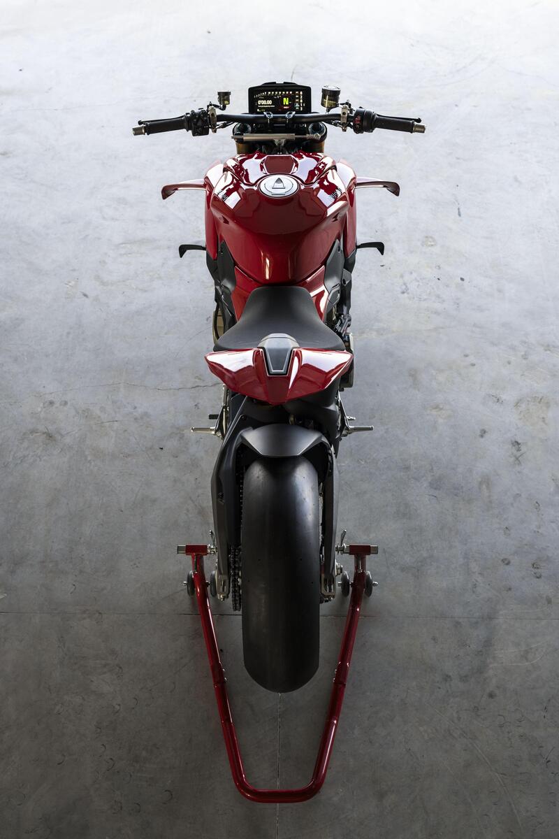 Sul Desmosedici Stradale del nuovo Streetfighter V4 è stato rivisto il diagramma della distribuzione rispetto alla versione del modello precedente, con camme dal diverso profilo e un valore di alzata più elevato. L’alternatore e la pompa dell’olio sono gli stessi montati sulla Panigale V4 R, mentre il tamburo del cambio è quello utilizzato sulla Superleggera V4. E per la prima volta, anche sullo Streetfighter V4 sono presenti i cornetti di aspirazione a lunghezza variabile, con un valore di 25 mm nella configurazione corta e di 80 mm in quella lunga.