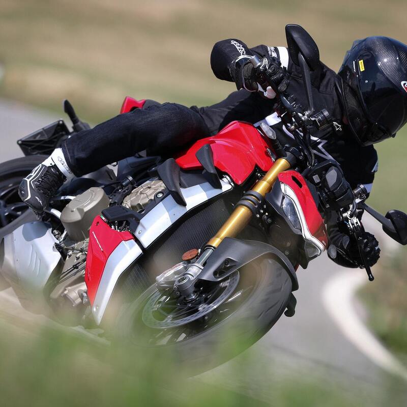 Estetica, con le famose ali biplano, e ciclistica non cambiano. Così come resta la leggerezza (178 kg di peso a secco) e non cambia nemmeno la potenza massima del motore V4 Desmosedici Stradale di 1.100 cc.