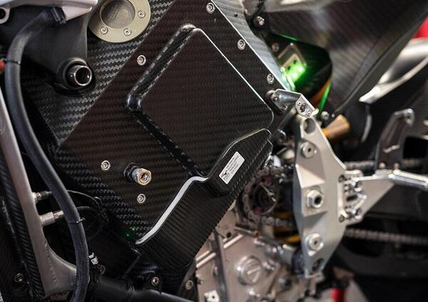 L’involucro del pacco batteria è realizzato in fibra di carbonio e svolge anche la funzione di parte stressata della ciclistica, analogamente a quanto avviene per il motore della Ducati Panigale V4, con un telaio monoscocca Front Frame in alluminio per la zona anteriore dal peso di 3,7 kg.