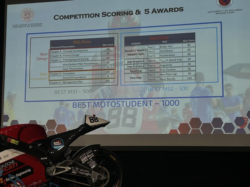 La fase MS2 ha rappresentato il banco di prova del progetto, dove la moto è stata sottoposta a una serie di prove dinamiche mirate a garantire sicurezza e funzionalità in condizioni di guida. Questa fase è culminata nella gara universitaria internazionale FIM, tenutasi presso il FIM Road Racing Circuit di MotorLand Aragón lo scorso 15 ottobre.