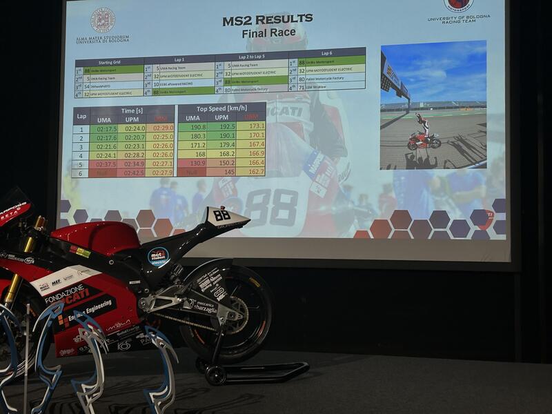 Borgo Panigale – Ducati e Università di Bologna hanno celebrato la vittoria del racing team di UniBo nella categoria Electric della competizione MotoStudent 2023, che si è svolta dall'11 al 15 ottobre nel circuito di Aragón in Spagna.