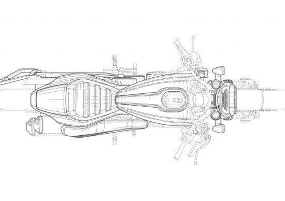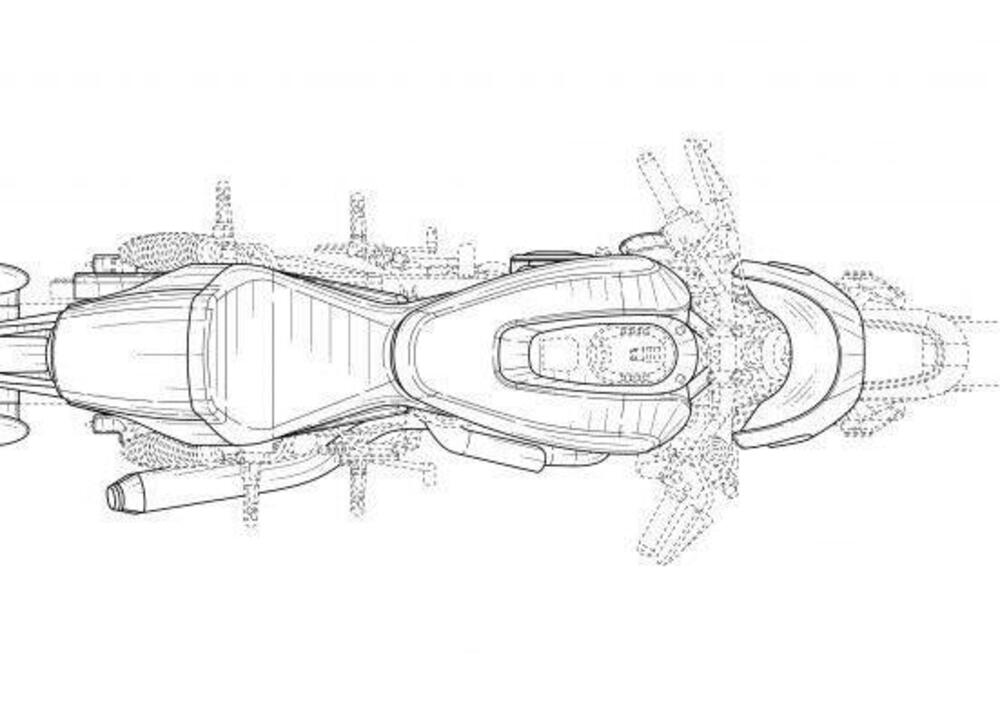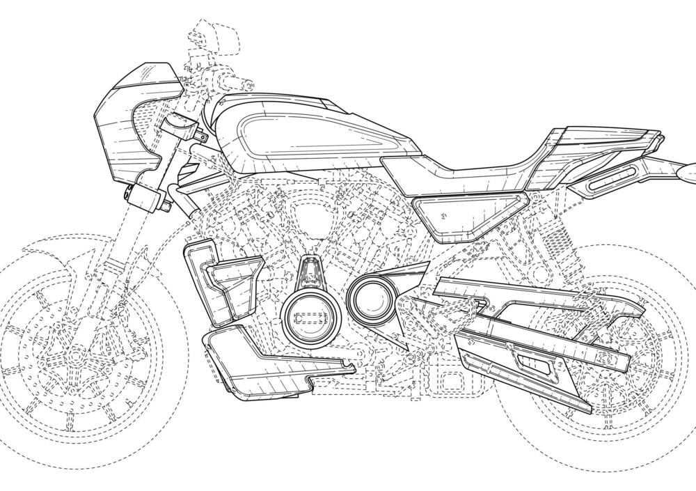 Rispetto alla flat track, la café racer ha manubrio più basso e stretto, pedane più alte e arretrate e, sembrerebbe dai disegni, la ruota anteriore da 17 pollici.