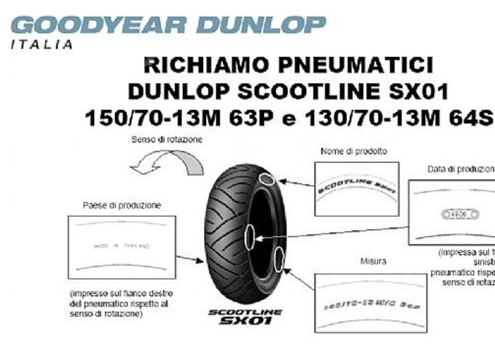 Entrambe le misure dei pneumatici in questione non fanno parte dell’equipaggiamento di serie ma sono vendute solo come ricambi per numerosi scooter. Vogliamo sottolineare che nessuna altra misura di pneumatici Dunlop Scootline SX01 venduta in Europa è oggetto di azioni di richiamo.