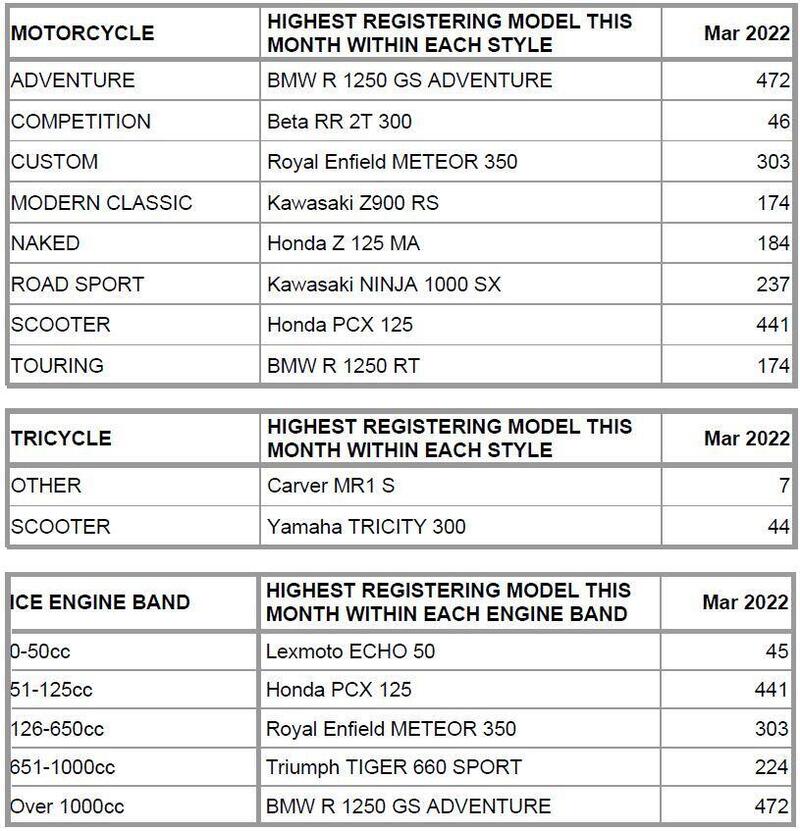 Venendo ai modelli più venduti nel mese di marzo, ricordiamo che l'associazione industriale di categoria segnala solo i più venduti dei relativi segmenti e delle diverse fasce di cilindrata, va rilevata l'ottima prestazione della BMW R1250GS Adventure. La maxi enduro tedesca con 472 unità ha superato persino lo scooter Honda PCX125, solitamente al primo posto assoluto. Altre moto che si sono segnalate sono la Royal Enfield Meteor 350 (303 unità), la Kawasaki Ninja 1000SX (237) e la Triumph Tiger Sport 660 (224).