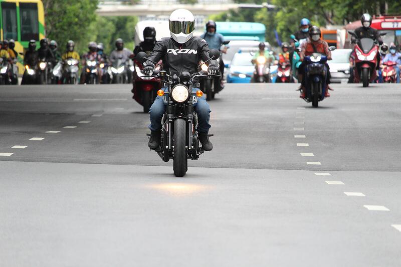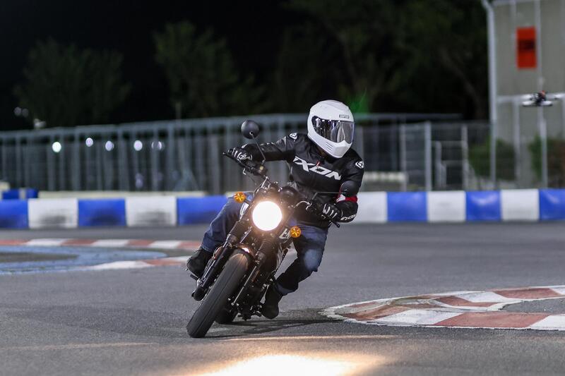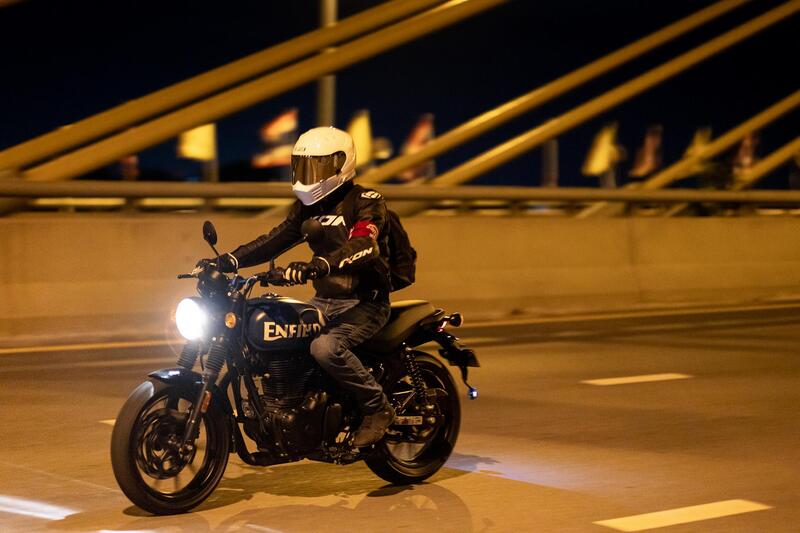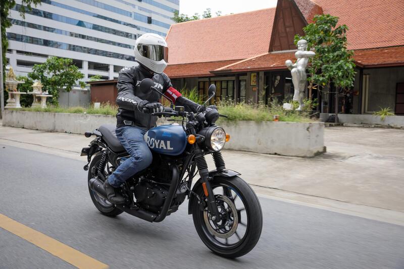 Dopo tutte queste premesse tecniche, veniamo adesso alla parte dinamica della Hunter 350. Facile, comunicativa e diremmo quasi empatica con il suo pilota, a partire da una posizione di guida accogliente un po' per tutte le taglie, anche per i gamba lunga che non corrono il rischio di interferenze con il manubrio nelle svolte strette: per quanto sia una moto di dimensioni complessive contenute, l'abbondante spazio in sella permette di trovare la posizione di guida più comoda e allo stesso tempo di poggiare facilmente entrambi i piedi a terra anche se si è di statura “compatta”. Il manubrio è ampio, rivolto moderatamente verso il pilota, le leve - non regolabili - non affaticano, il comando del gas è scorrevole quanto il pedale del cambio e la sensibilità sul pedale del freno posteriore non manca. Contribuisce al comfort l'assenza di avvertibile calore alle gambe che noi abbiamo registrato in misura marginale solo nei 35 gradi di Bangkok e restando spesso fermi al semaforo per alcuni minuti.