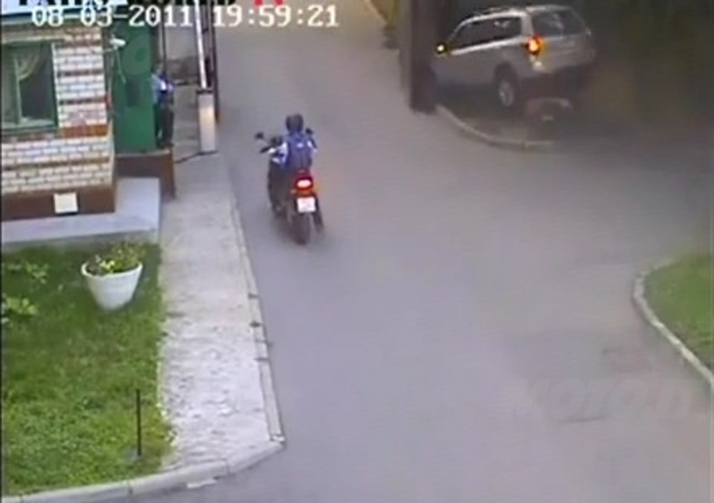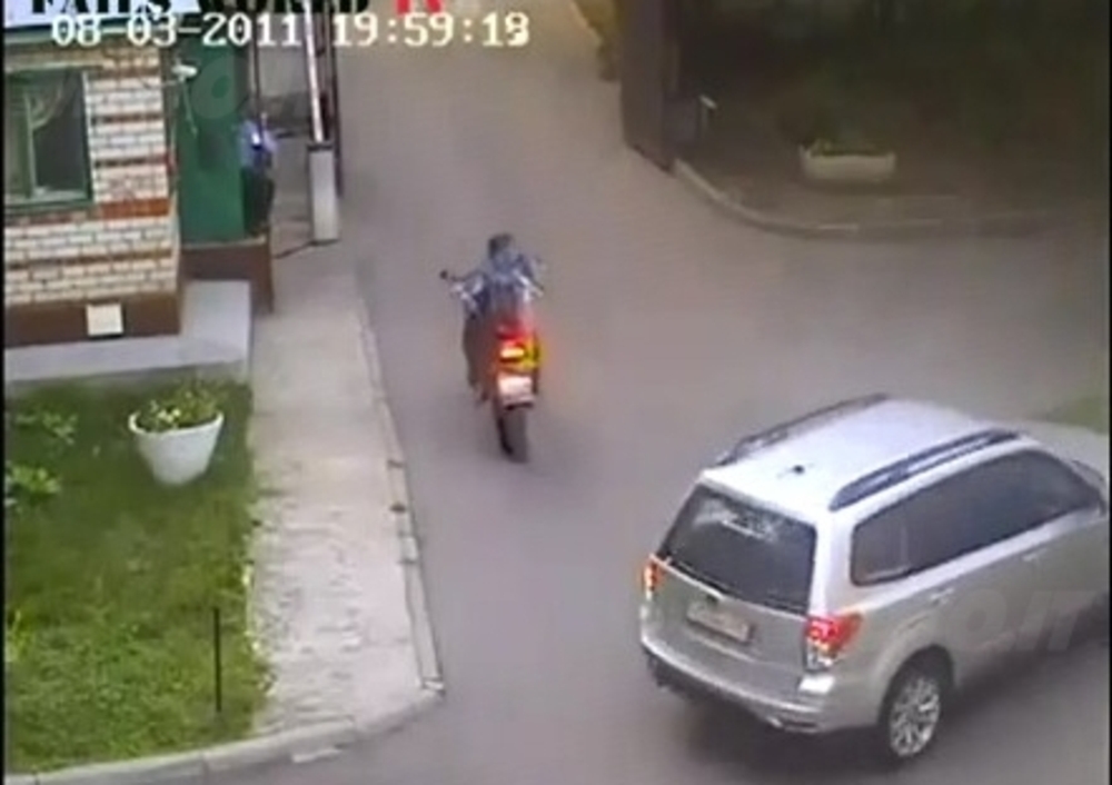 Per fortuna non si è fatto male nessuno, ma che rischio! Guardate il povero motociclista attonito, "quasi vittima" della totale incapacità di un automobilista davvero fuori controllo.