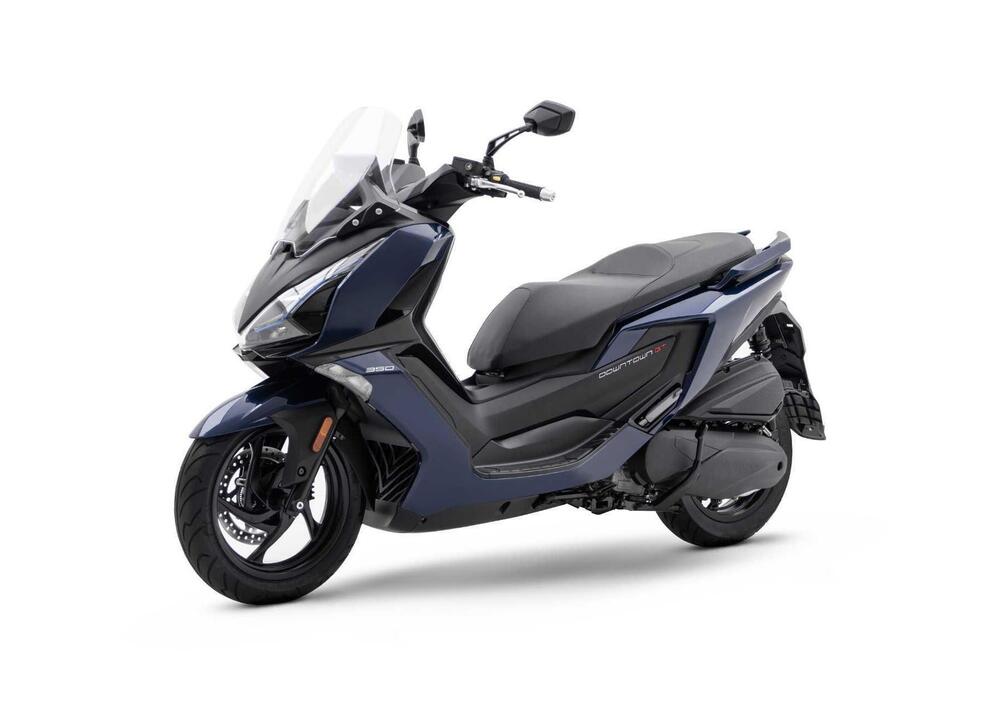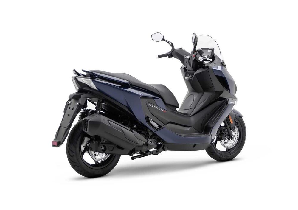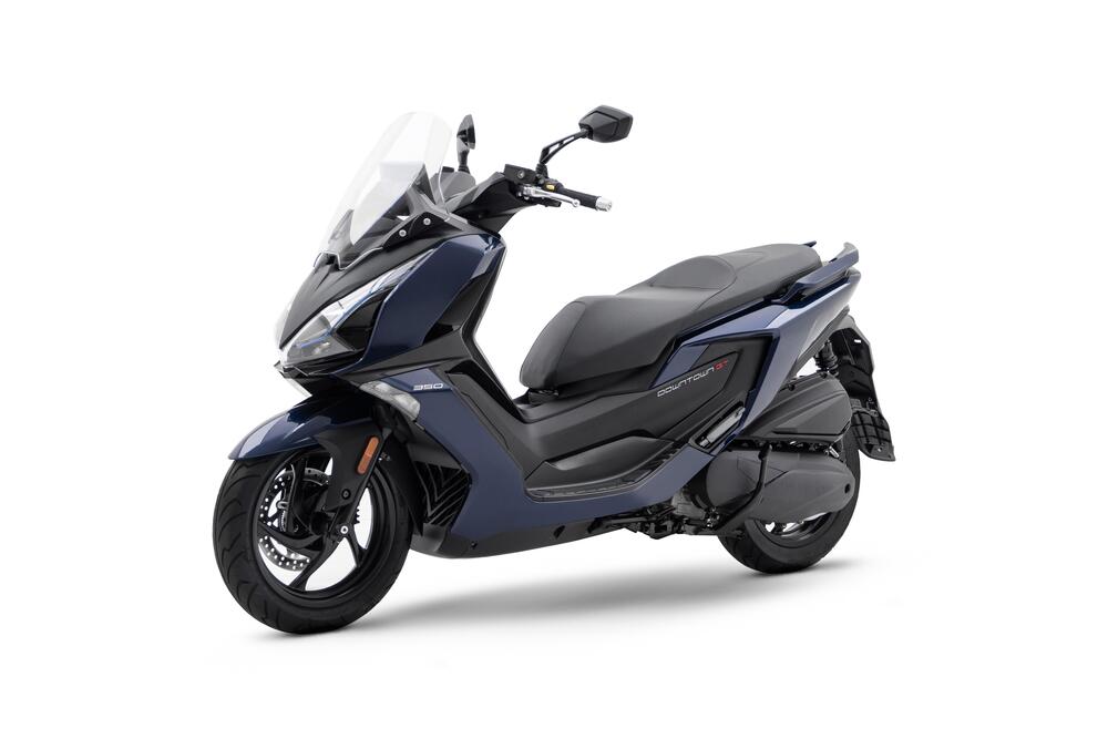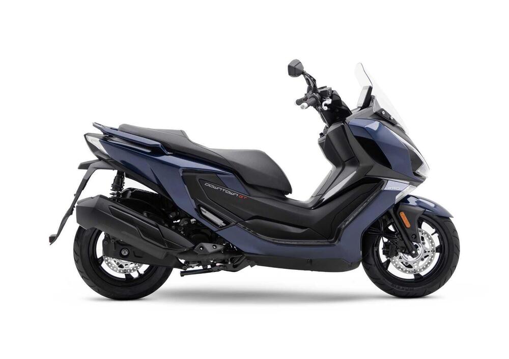 La parte anteriore dello scudo ospita i gruppi ottici con tecnologia full LED a sviluppo verticale e gli indicatori di direzione montati a filo con la superficie della carrozzeria. La vista laterale del Downtown 350GT conferma la sua vocazione da scooter cruiser. La pedana consente una grande libertà di movimento sia longitudinalmente (con più punti di appoggio per i piedi), sia orizzontalmente, grazie alla superficie disponibile particolarmente ampia.
