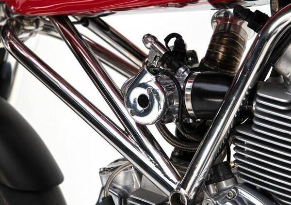 La moto è stata costruita da zero partendo dall'impianto elettrico e se colpisce la forma del blocco serbatoio/sella (una monoscocca di alluminio parzialmente verniciata e per il resto lucidata a specchio), non sfugge la cura per ogni dettaglio.