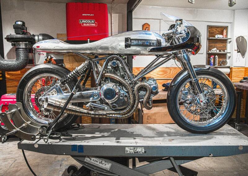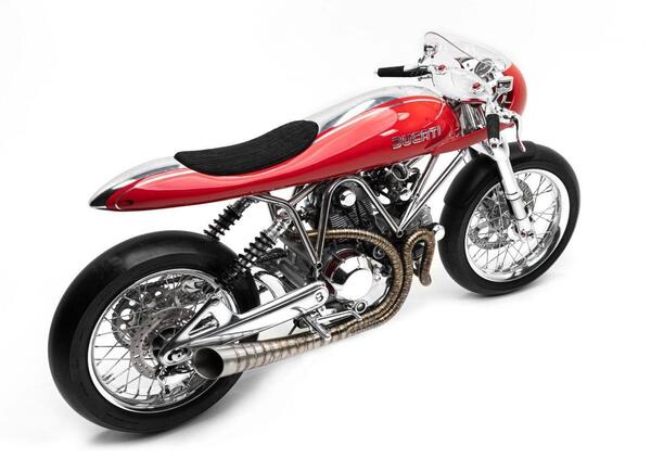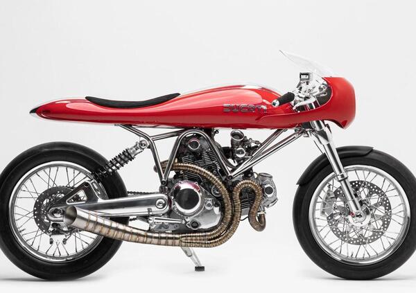 Attorno il motore di una Ducati Monster 1100 di metà anni Duemila, acquistato usato, è stato disegnato un inedito telaio in tubi di acciaio inox che si accorda proprio al disegno del V di 90° raffreddato ad aria Ducati.