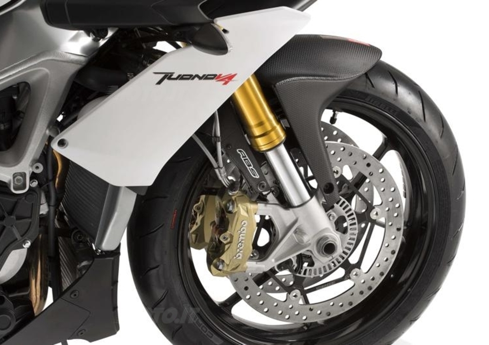 Tuono V4 R ABS guadagna un nuovo impianto frenante anteriore con inedite pinze monoblocco ad attacco radiale Brembo M432 e dischi in acciaio da 320 mm con piste frenanti di altezza ridotta e foratura asimmetrica che hanno permesso di rendere la potenza frenante più modulabile.